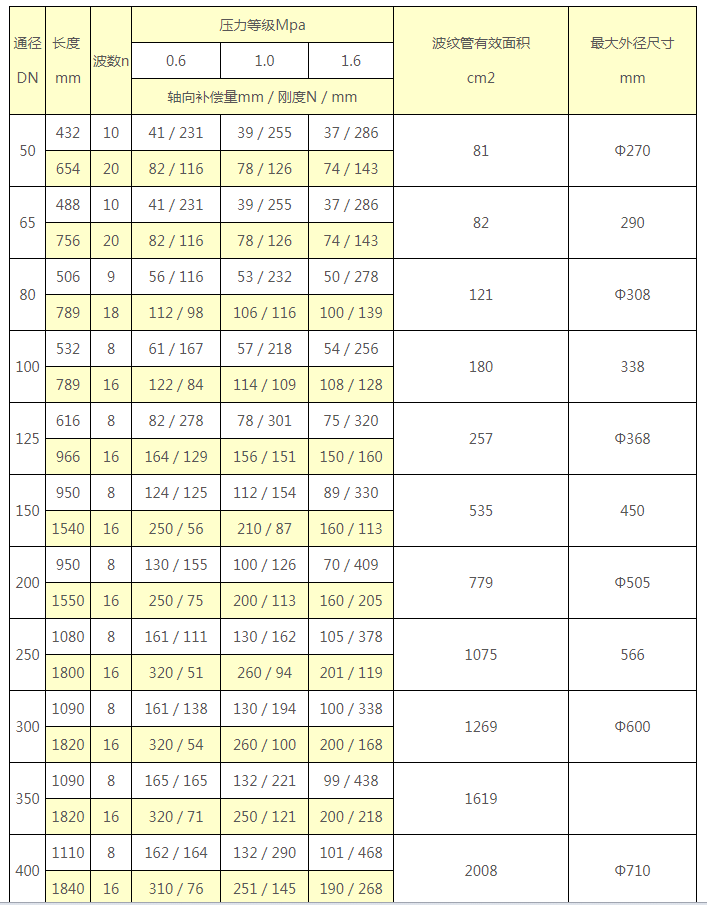舉例:0.6TWY500×8JB表示:公稱通徑為500mm,工作壓力為0.6MPa(6kg/cm2)波數(shù)為8個(gè),不銹鋼管連接的軸向型外壓式波紋補(bǔ)償器。